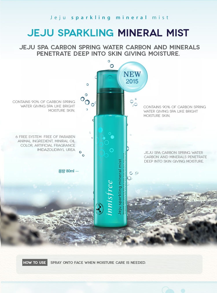 Innisfree Jeju Sparkling Mineral Mist được trang bị đến hơn 90% thành phần là nước suối tinh khiết vùng núi Sanbang thuộc vùng đảo Jeju nổi tiếng. Nguồn nước siêu sạch chảy sâu trong lòng đất sở hữu làm lượng khoáng chất quý hiếm với hơn 16 loại khoáng trong đó 3 loại có nồng độ cao (H2CO3, HCO3-,CO32-) và 13 loại khoáng chất khác được kiểm chứng tốt cho làn da. Xịt khoáng bổ sung hàm lượng khoáng chất  giàu dinh dưỡng giúp dưỡng ẩm da hiệu quả, cho tác dụng giải cứu làn da khô mất nước, da tổn thương do quá nhiệt.