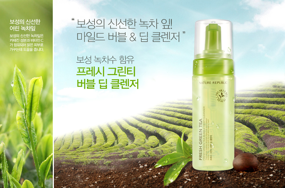 Nature Republic Fresh Green Tea Bubble Deep Cleanser có thành phần chiết xuất 30% lá trà xanh Bosung Hàn Quốc giúp làm sạch sâu bên trong lỗ chân lông, cung cấp độ ẩm cho da, đồng thời kiềm dầu, ngừa mụn kháng viêm, cho da mềm mại, mịn màng.