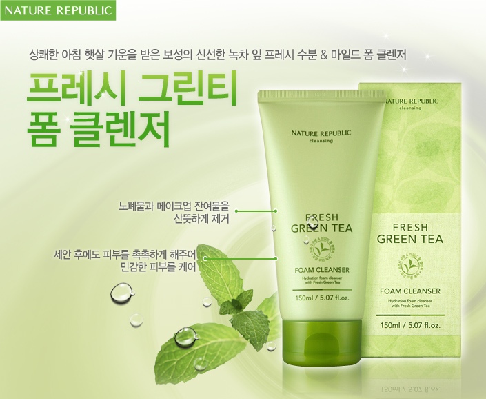 Nature Republic Fresh Green Tea Foam Cleanser là sản phẩm thiên nhiên an toàn, dịu nhẹ, giúp làm sạch da, loại bỏ bụi bẩn, bã nhờn và những tạp chất làm bít tắc lỗ chân lông gây ra mụn, giúp da mịn màng, sáng hơn và khỏe mạnh hơn.