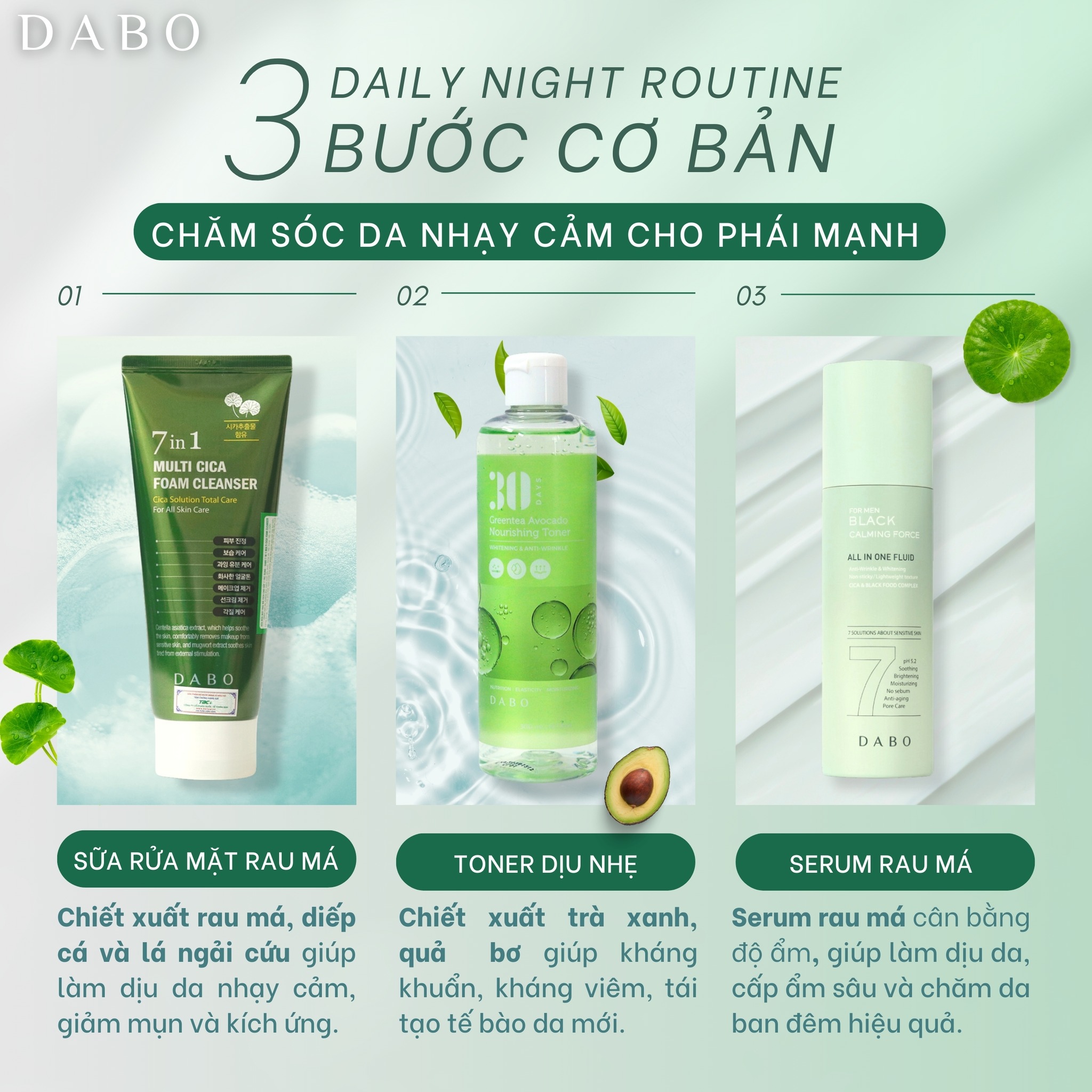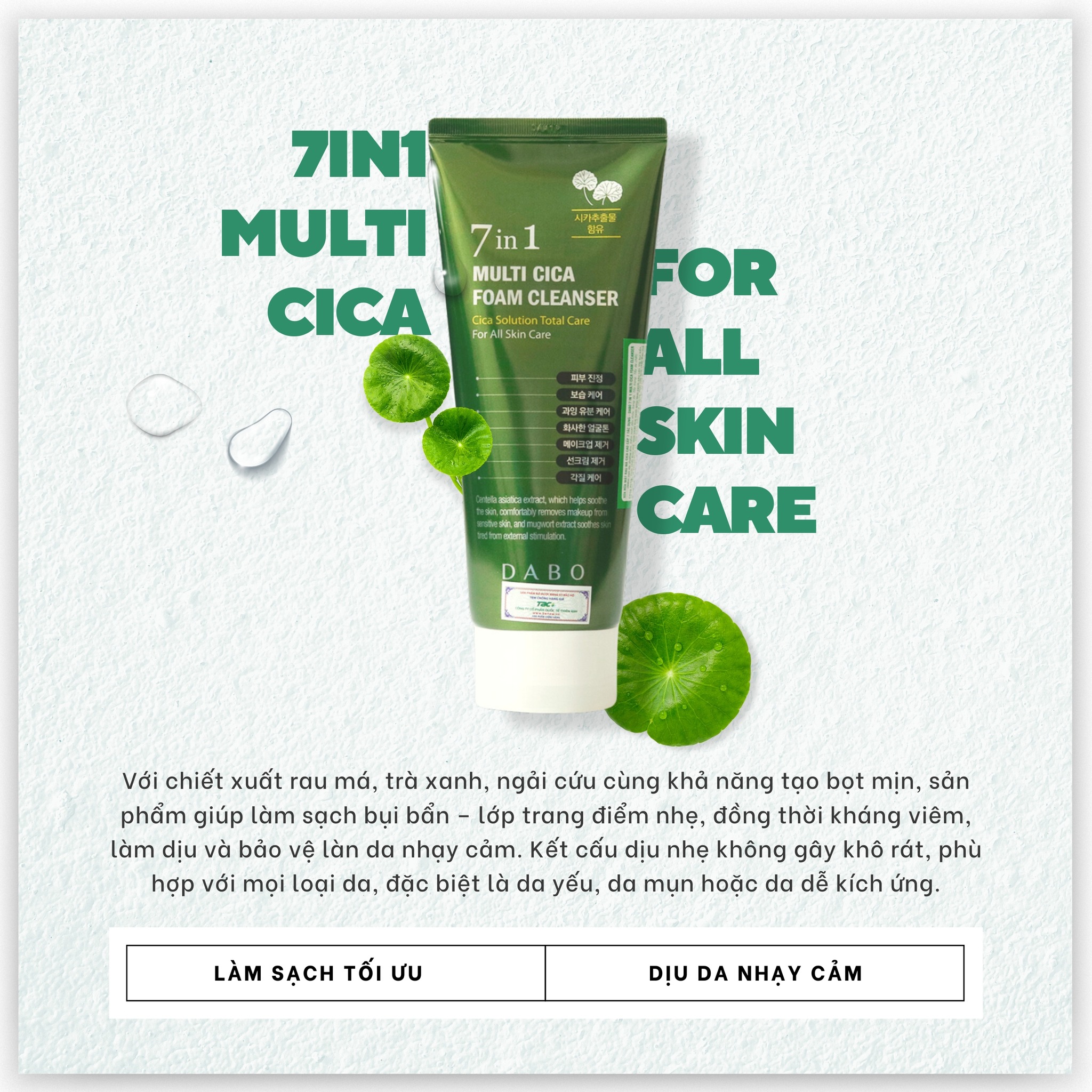 Bước làm sạch luôn là khâu quan trọng nhất trong chu trình chăm sóc da buổi tối. Sữa rửa mặt 7in1 Multi Cica Foam Cleanser với chiết xuất rau má, diếp cá và lá ngải cứu giúp loại bỏ bụi bẩn, bã nhờn tích tụ suốt ngày dài mà không làm da khô căng hay mất cân bằng.