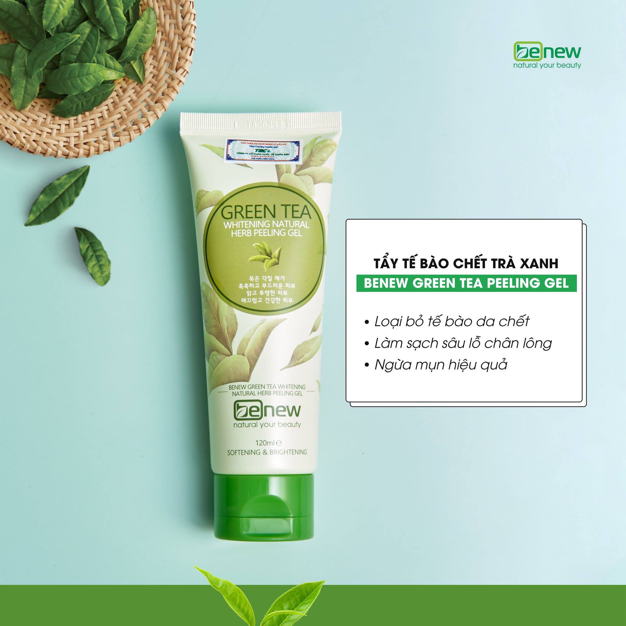 Kem tẩy tế bào chết từ trà xanh là dòng sản phẩm mới nhất của thành phần chính gồm có Trà xanh giàu vitamins C và E, trà xanh được biết đến là chất chống oxy giúp bảo vệ làn da dưới tác hại của ánh nắng mặt trời, ngăn ngừa việc da bị lão hóa đến sớm, làm tăng độ sáng của da, đẩy mạnh việc tái tạo tế bào da mới, và quan trọng hơn nó còn có tác dụng ngăn ngừa các loại ung thư da… Kem BENEW GREEN TEA PEELING GEL nhẹ nhàng làm dịu mụn sưng đỏ, đồng thời lấy những chất bủi bẩn, chất sừng và mụn cám trên da một cách hiệu quả, mang đến cho bạn một làn da mịn màng, tươi mới. Bên cạnh đó, dầu ôliu có trong kem sẽ giúp nuôi dưỡng, giúp da trắng dần lên, đồng thời giúp da săn chắc hơn. Sản phẩm chiết xuất từ những thành phần tự nhiên nên tuyệt đối an toàn đối với người sử dụng.