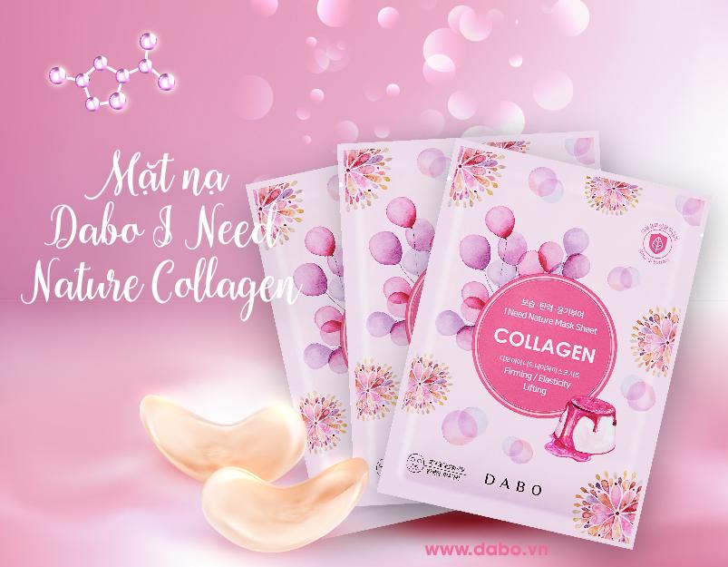 Công dụng: Mặt nạ DABO I NEED NATURE COLLAGEN chứa tinh chất Collagen tươi nguyên chất đậm đặc kết hợp cùng với các Protein tự nhiên thẩm thấu sâu vào da giúp Phục hồi da hư tổn, Nâng cơ da, Làm mờ nếp nhăn, Trắng da, Chống lão hoá, đồng thời kích thích da sản sinh và bổ sung Collagen nhằm tái tạo và sản sinh tế bào da mới, cho làn da luôn căng mịn, hồng hào. Thích hợp với mọi loại da, hiệu quả đặc biệt với da thường, da khô.