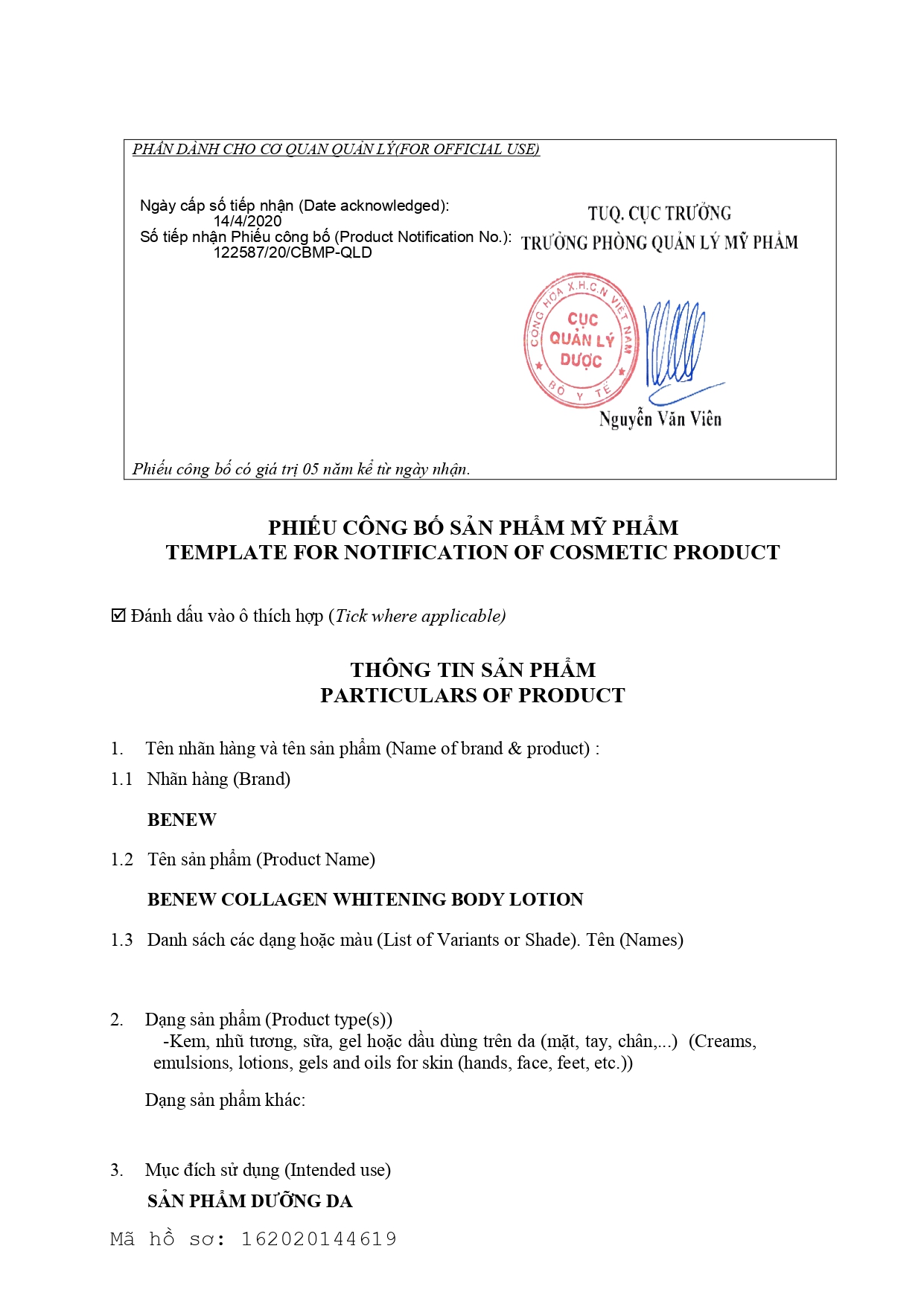 Giấy Công bố mỹ phẩm Kem body Collagen Benew (Cục Quản Lý Dược Việt Nam Cấp)