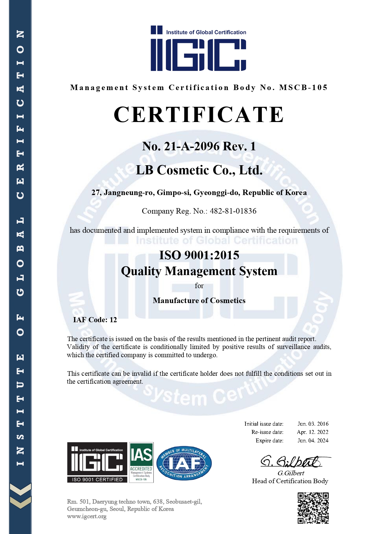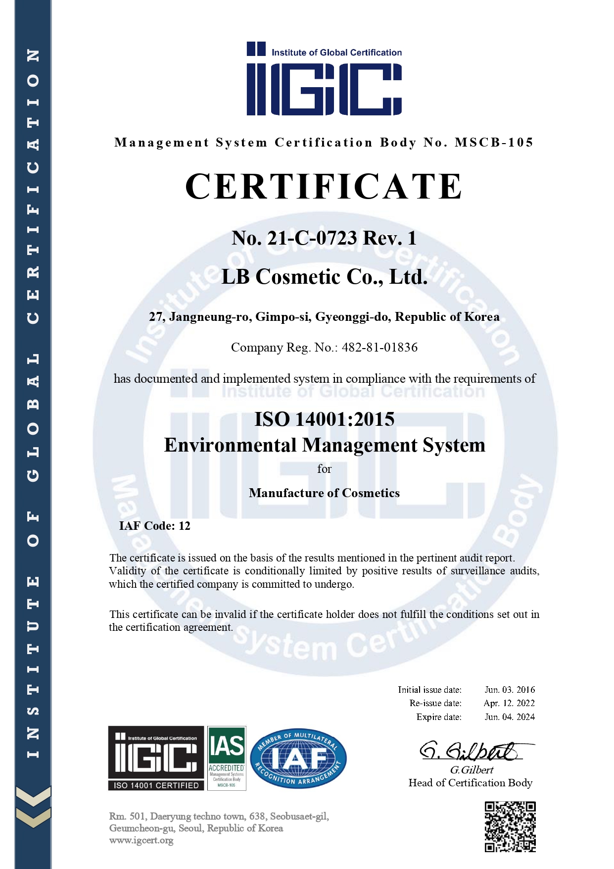 Chứng nhận đạt chuẩn Quốc Tế nhà máy sản xuất LB Comesstic Co., Ltd Kem Body Collagen Benew