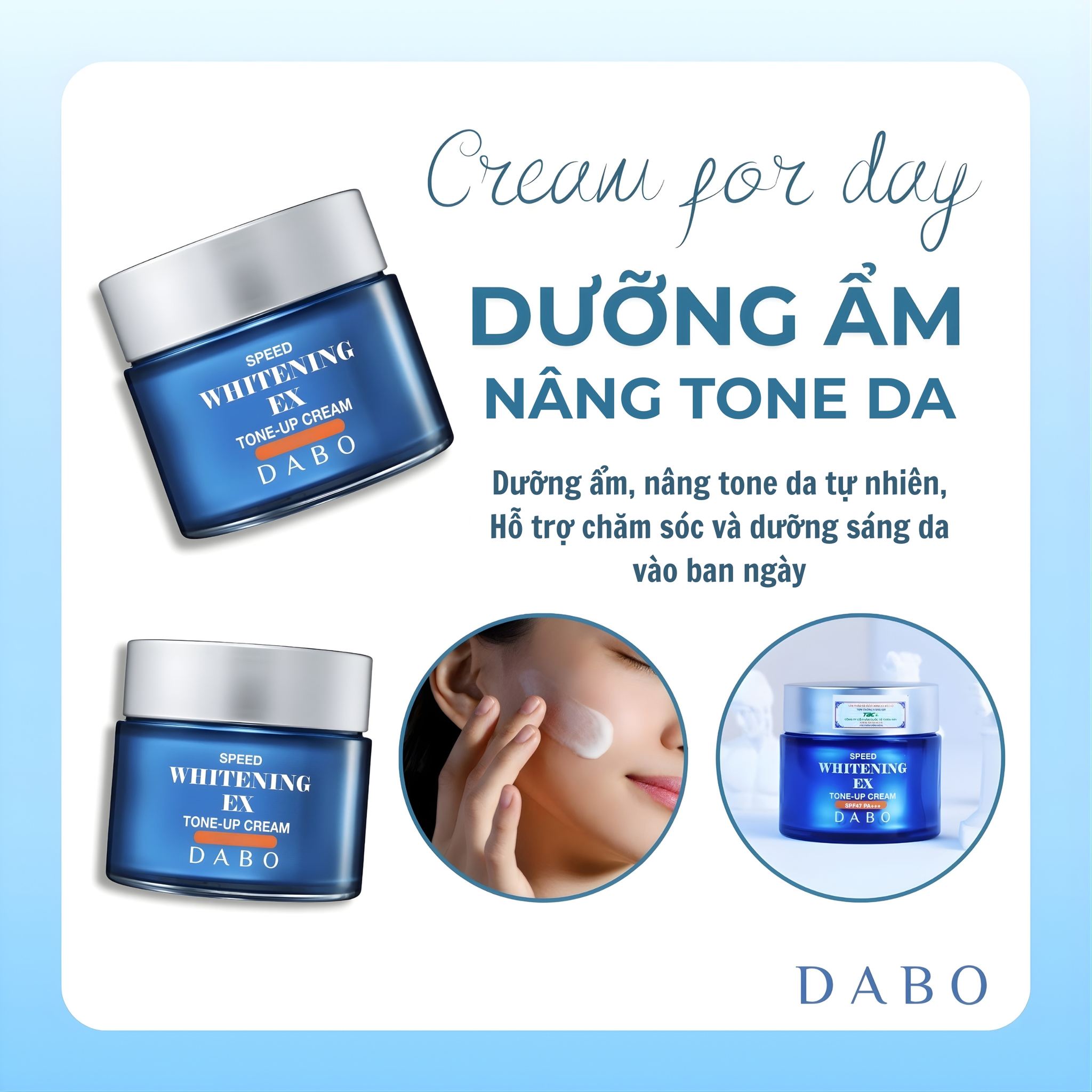 Tổng hợp từ tinh chất collagen, bột ngọc trai và mật ong, kem dưỡng trắng da DABO Speed Whitening-Up giúp nhanh chóng cải thiện và tăng độ trắng sáng của làn da rất hiệu quả mà an toàn, ngoài ra còn giúp kích thích tái tạo tế bào da, phục hồi độ săn chắc cho da, loại bỏ những sắc tố đen, làm phai vết nám, làm mờ tàn nhang, đồng thời cung cấp độ ẩm cần thiết giúp da mềm mịn và tăng độ đàn hồi.