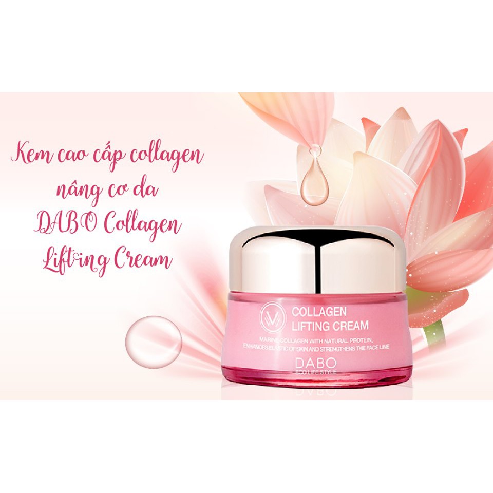 Kem cao cấp Collagen nâng cơ da - DABO Collagen Lifting Cream có tác dụng  phục hồi da, chiết xuất từ Collagen thủy phân tự nhiên có khả năng thẩm thấu sâu vào da giúp nâng cơ và làm săn chắc vùng da bị chùng nhão, chảy xệ do lão hóa, xóa mờ nếp nhăn, đồng thời kích thích da sản sinh và bổ xung Collagen nhằm tái tạo và sản sinh tế bào da mới, cải thiện độ đàn hồi, cho làn da căng mịn, mượt mà. DABO Collagen Lifting Cream còn sở hữu thành phần thiên nhiên như lô hội, dầu Olive... giúp dưỡng ẩm,chống oxy hóa vượt trội, thúc đẩy chuyển hóa các mô liên kết, gia tăng sức đề kháng, khả năng kháng viêm, kháng khuẩn cho da. Hiệu quả tốt cho da bắt đầu bị lão hóa sau tuổi 30, thích hợp với da thường, da khô. Kết cấu kem lỏng, màu trắng đục, mỏng nhẹ và thấm tương đối nhanh. Lọ kem dung tích 50 ml hiện có giá ưu đãi đến 38%, giảm còn 305.000 đồng.