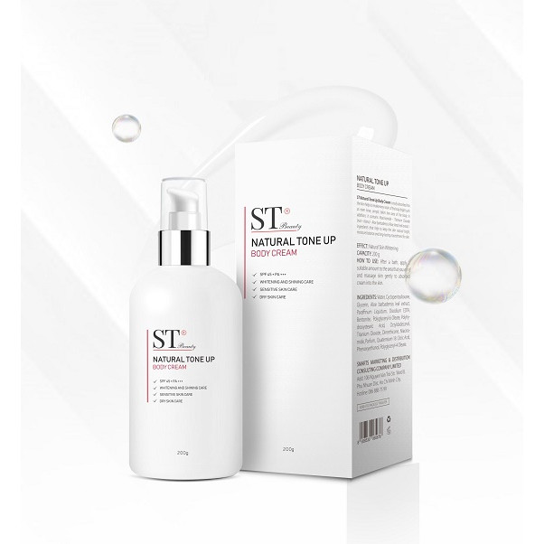 Kem dưỡng thể body Hàn Quốc ST Beauty có tác dụng làm trắng và bật tông da tự nhiên với các thành phần chính như Niacinamide, Titanium dioxide, Aloe barbadensis leaf extract.