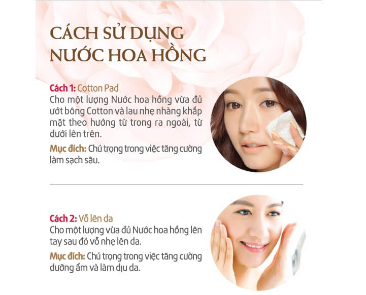 Nêu sử dụng nước hoa hồng 2 lần một ngày sau khi rửa mặt. Bạn có thể kết hợp với bông tẩy trang hoặc xịt thẳng lên mặt và vỗ nhẹ để nước hoa hồng thấm sâu vào lỗ chân lông.