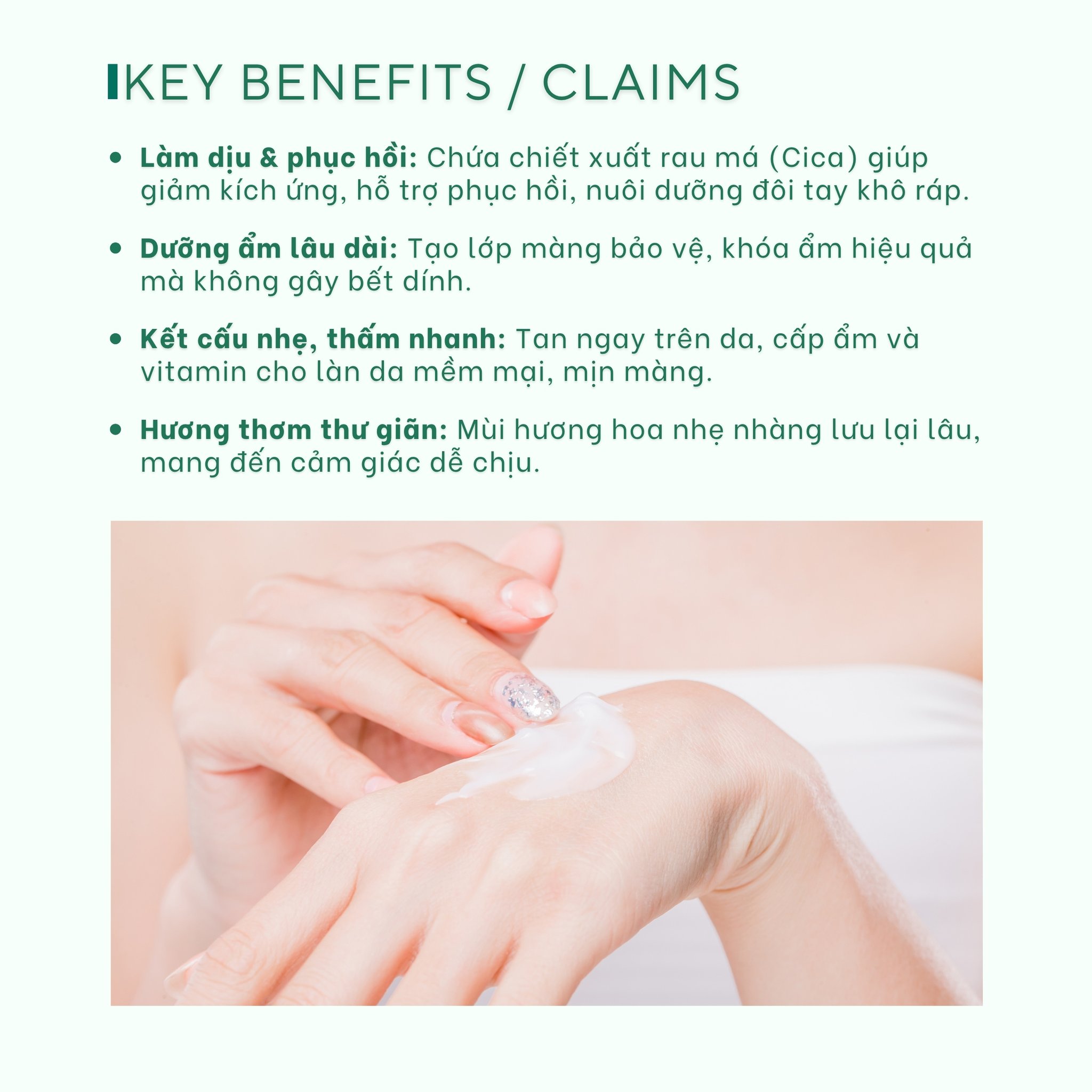Hyaluronic Acid: có khả năng giữ nước gấp nhiều lần trọng lượng của nó, mang đến hiệu quả cấp ẩm sâu, giữ cho da tay luôn căng mọng.