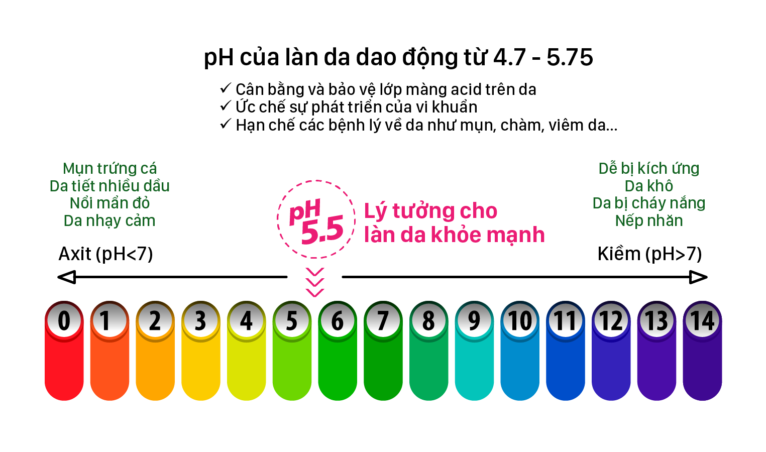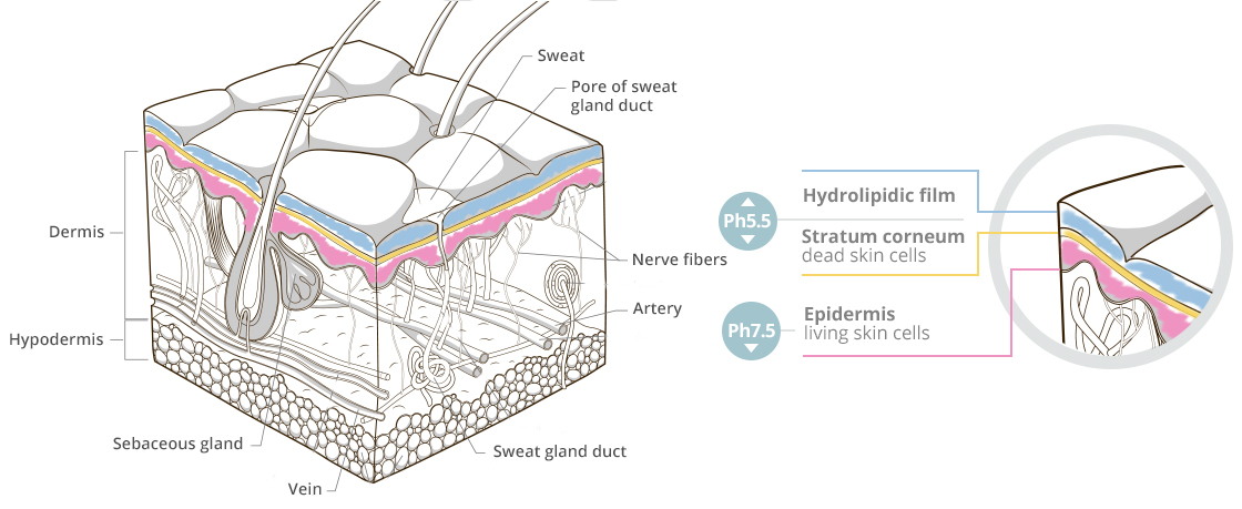 Làn da khỏe đẹp tự nhiên có độ pH5.5 giúp củng cố lớp màng axit da và lớp màng này có tác dụng ngăn chặn hầu hết các tác nhân ô nhiễm, vi khuẩn và nấm gây hại, xâm nhập vào bên trong da. Người ta gọi đây là màng axit bảo vệ da.