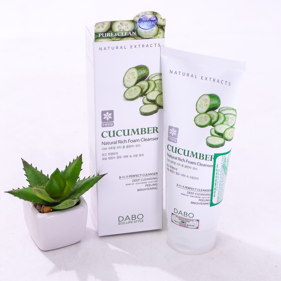 Công dụng: Sữa rửa mặt Dabo Dưa Leo cao cấp 3-IN-1 có 3 chức năng chính: Làm trắng sáng làn da; Tẩy nhẹ lớp tế bào chết; Làm sạch sâu lỗ chân lông và tẩy trang. Tinh chất Dưa leo giúp làm mờ vết nám và tàn nhang, giảm nếp nhăn, tăng độ đàn hồi cho da, cân bằng và bổ xung độ ẩm cho da, làm giảm nhờn, thích hợp với mọi loại da.