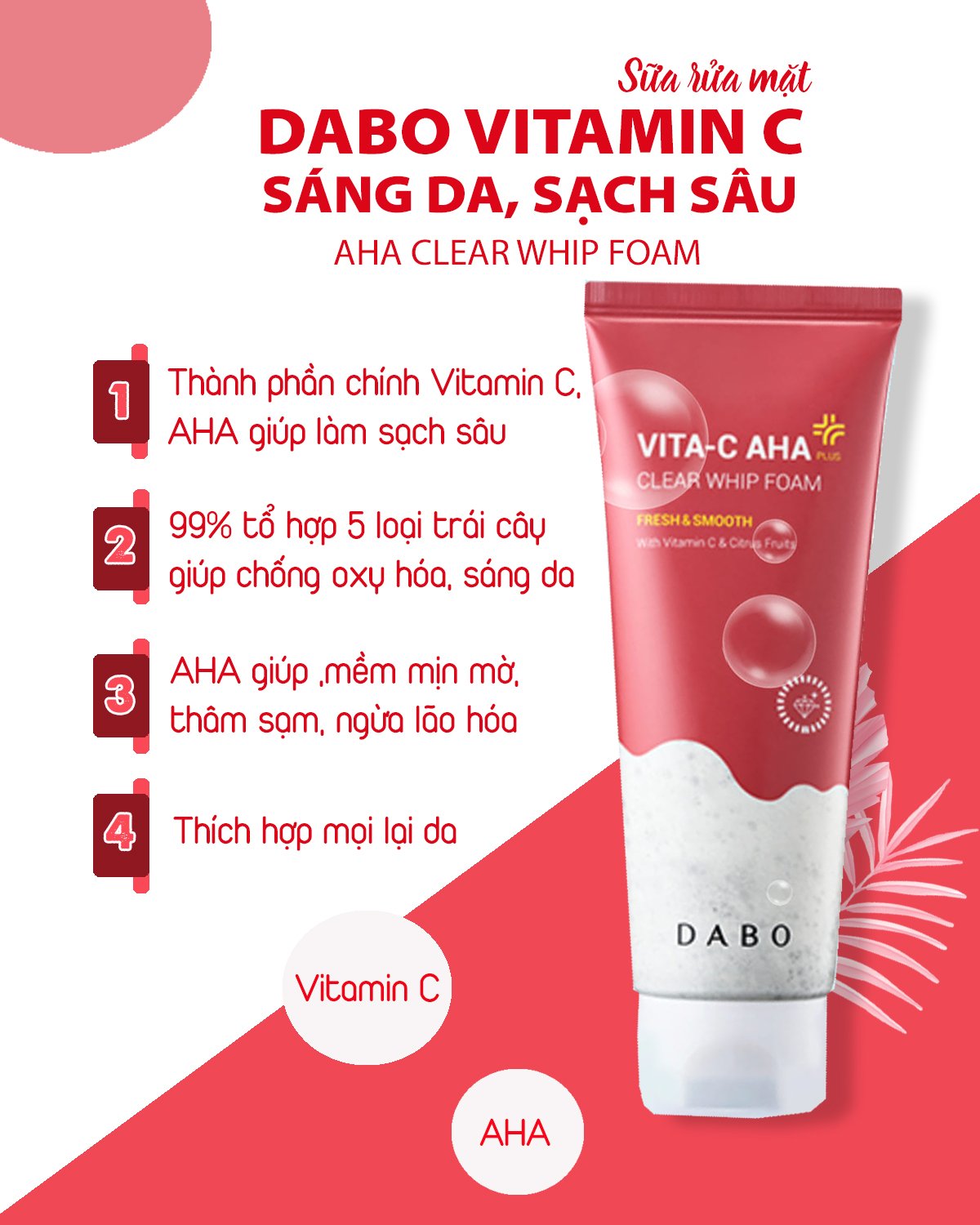 Công dụng: Sữa rửa mặt Vitamin C kết hợp với AHA làm sạch sâu và lấy đi toàn bộ bụi bẩn và bã nhờn trên da. Tổ hợp Vitamin C 99% tổng hợp từ 5 loại trái cây giúp chống oxy hóa, làm sáng da, thu nhỏ lỗ chân lông, ngăn ngừa và giảm mụn trên da. AHA giúp làn da mềm mịn, làm mờ các vết thâm sạm, ngăn ngừa lão hóa da rất hiệu quả. Thích hợp cho mọi loại da.