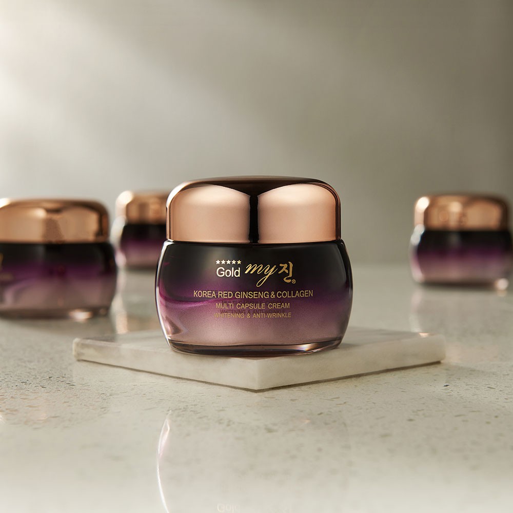 Hồng sâm Hàn Quốc ra quả duy nhất một lần trong 04 năm với lượng Polisacarit và Saponin cao gấp 15 lần so với tinh chất nhân sâm thông thường. Kem dưỡng cao cấp đặc biệt My Gold Multi Capsule Cream được tổng hợp từ: Tinh chất của Quả nhân sâm 06 năm tuổi, kết hợp với Vitamin và Collagen được cô đặc dạng hạt nang mềm được coi là phát kiến mới vô cùng độc đáo trong ngành mỹ phẩm Hàn Quốc.