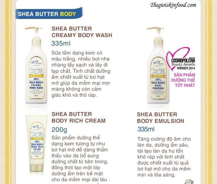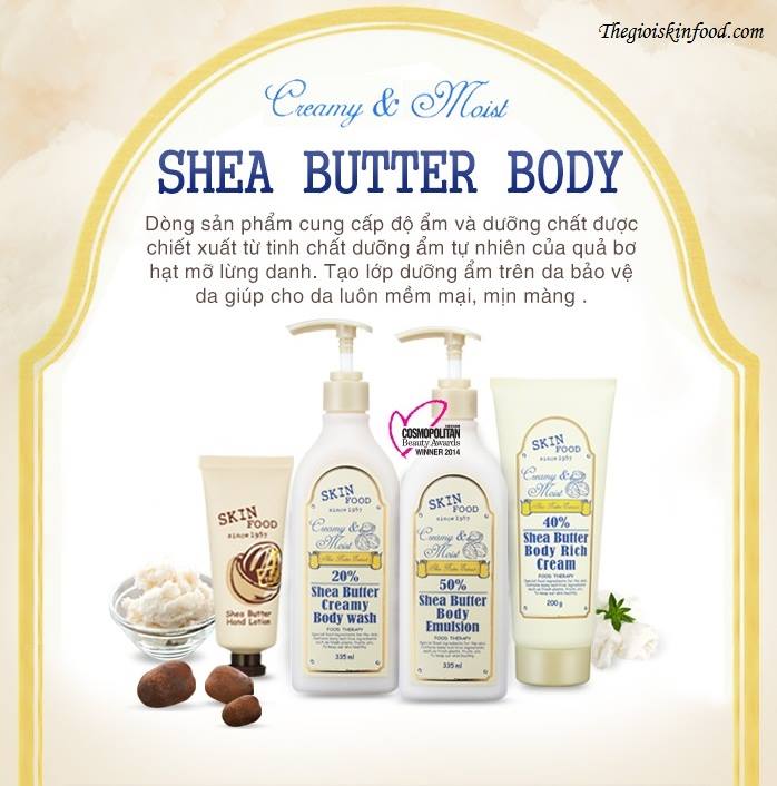 Từ tên gọi của dòng kem dưỡng thể này, Skinfood đã “spoil” cả thành phần cấu tạo bên trong tuýp sản phẩm rồi. Shea Butter Body Rich Cream có chiết xuất từ cây bơ hạt mỡ ở Châu Phi. Đây là một loại thực phẩm vẫn còn khá mới mẻ đối với con gái Việt chúng ta, và chỉ thật sự phổ biến và nghe nhắc đến nhiều khi mà các dòng sản phẩm chăm sóc da ngoại nhập oanh tạc trên thị trường mà thôi. Bơ hạt mỡ là một loài bơ thực vật, chiết xuất từ hạt cây Shea-Karite thường mọc ở một số khu vực phía Đông hoặc Tây Phi. Loại bơ này là một trong số những tài sản quý nhất thuộc vùng nhiệt đới châu Phi, được ưu ái với danh xưng “Gold of women”, hiểu nôm na là vàng của phụ nữ, được ví von như loại cây thần kỳ, thần dược giúp các cô gái sở hữu làn da săn chắc và trẻ trung trong nhiều thế kỉ qua, thậm chí cực kì an toàn để có thể sử dụng trong thai kỳ nhằm hạn chế tối đa các vết rạn da trên cơ thể của các mẹ bầu nhờ các dưỡng chất quan trọng có thể kể đến như các acid béo, chất chống oxi hóa tự nhiên, cinamates, phytosterol,..cho tác dụng dưỡng ẩm sâu, làm trẻ hóa da, kết hợp với trữ lượng vitamin A, E, F thiết yếu cho làn da, khôi phục độ đàn hồi cùng sự săn chắc của da mà những tưởng đã bị mất dần theo năm tháng. Trong mỗi tuýp kem dưỡng da Shea Butter Body Rich Cream lại chứa đến 40% dưỡng chất từ bơ hạt mỡ, một nguồn dưỡng ẩm cực kì dồi dào và phong phú để lớp body cream dày có thể tan chảy lập tức trên da, thẩm thấu từ sâu bên trong, đồng thời tạo ra một rào chắn hình thành từ độ ẩm, giữ cho làn da của bạn được mềm mại, mịn màng dài lâu. Với thành phần tự nhiên cực kì lành tính như thế, chất kem cũng sẽ không gây kích ứng cho làn da, không bắt nắng để có thể bảo vệ da toàn diện trước sự tấn công của ánh nắng mặt trời, bụi bẩn cùng với các tác nhân gây ô nhiễm môi trường. Đây quả là một sản phẩm cực kì hứa hẹn và rất đáng để trải nghiệm đấy!