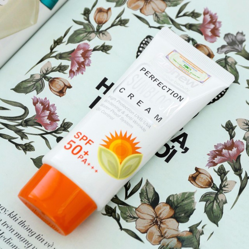 Kem chống nắng Benew Perfection Sunblock Cream là dòng kem chống nắng đa dụng kết hợp khả năng chống nắng, dưỡng da, kiểm soát nhờn. Kem được trang bị công thức chống nắng dịu nhẹ, an toàn cho da với chất chống nắng vật lý bao gồm: Zinc Oxide, Titanium Dioxide, Butyl Methoxydibenzoylmethane, Octinoxate. Kem thuộc loại chống nắng phổ rộng, bảo vệ da khỏi tác hại từ cả tia UVB (cháy nắng, sạm da) và tia UVB (lão hóa sớm, ung thư da). Với mức chỉ số chống nắng SPF 50 & PA+++, bạn có thể sử dụng Benew Perfection Sunblock Cream chống nắng hằng ngày hoặc khi tham gia các hoạt động ngoài trời, chơi thể thao đều phù hợp.
