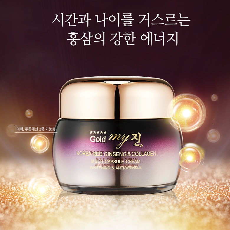 Hồng sâm Hàn Quốc ra quả duy nhất một lần trong 04 năm với lượng Polisacarit và Saponin cao gấp 15 lần so với tinh chất nhân sâm thông thường. Kem dưỡng cao cấp đặc biệt My Gold Multi Capsule Cream được tổng hợp từ: Tinh chất của Quả nhân sâm 06 năm tuổi, kết hợp với Vitamin và Collagen được cô đặc dạng hạt nang mềm được coi là phát kiến mới vô cùng độc đáo trong ngành mỹ phẩm Hàn Quốc.