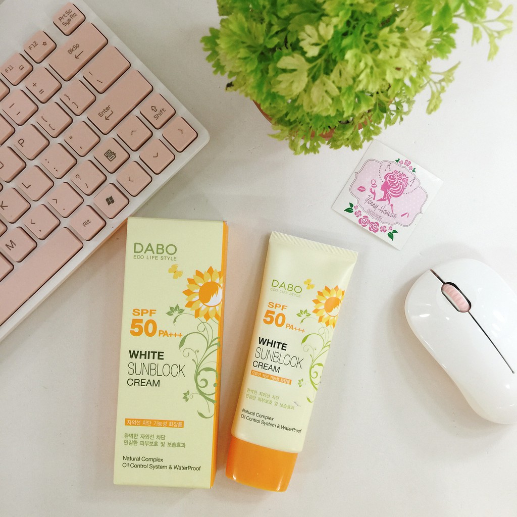 Kem chống nắng DABO White Sunblock Cream SPF50 pa+++ của Dabo là phiên bản kem chống nắng được yêu thích nhất của hãng, tất nhiên chất lượng cũng vượt trội hơn các sản phẩm khác. Dòng kem này có 3 công dụng chính: Chống tia UV hiệu quả (chỉ số SPF 50+ chống tia UVB 500 phút, PA+++ chống tia UVA 12 giờ) cải thiện nếp nhăn và làm sáng da nhờ tinh chất trà xanh, hoa hướng dương, cam và camellia.